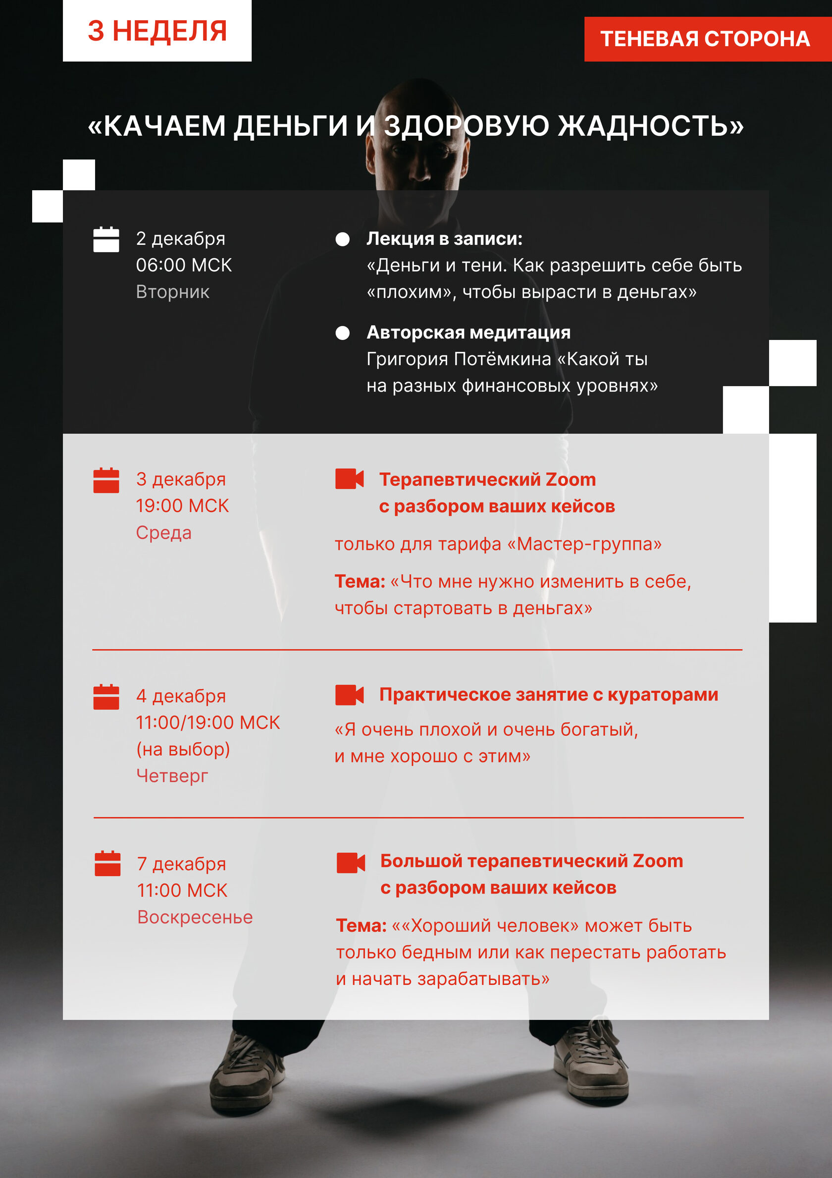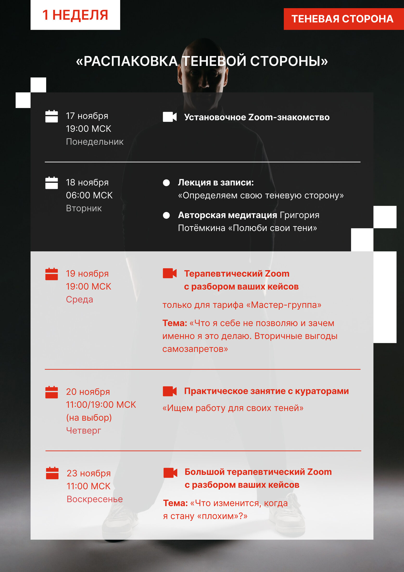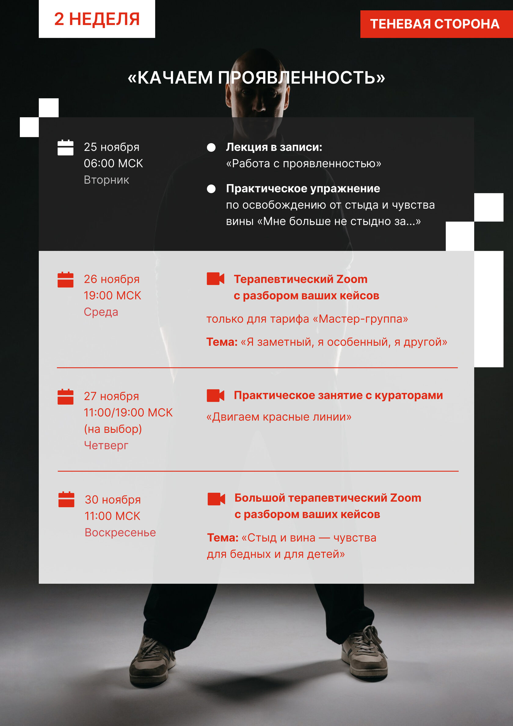 На этом курсе мы совершаем магию — зажигаем свет на теневой стороне. Легализуем «неправильные» качества - любовь к себе, любовь к деньгам, проявленность, здоровую сексуальность, здоровый эгоизм и тысячи других качеств — для того, чтобы обрести независимость, полюбить себя любым, вырасти в деньгах и отношениях.